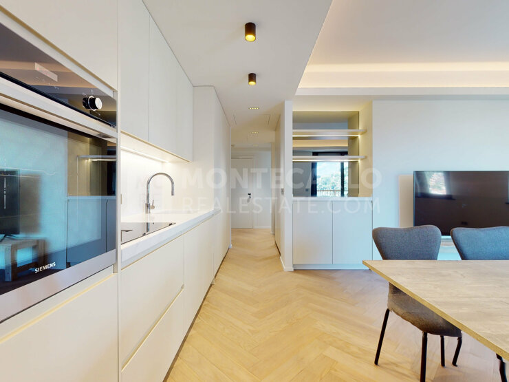 Somptueux deux pièces entièrement rénové avec des matériaux de haute qualité et des finitions raffinées. Il offre une entrée avec un couloir orné d'un espace bureau et de rangements sur mesure, s'ouvrant sur un somptueux séjour agrémenté d'une cuisine ouverte entièrement équipée. La chambre, avec sa luxueuse salle de bains attenante et son dressing sur mesure, offre un confort absolu. Une vaste terrasse dévoile une vue imprenable sur la mer et les majestueuses montagnes environnantes.