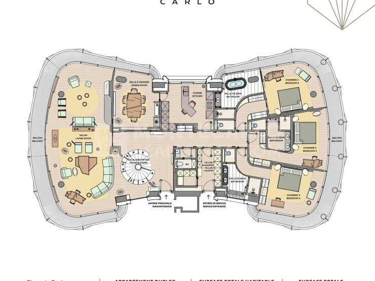 Situé aux 3ᵉ et 4ᵉ étages de l’immeuble C, ce magnifique duplex de 410 m² bénéficie d’espaces généreux et d’une architecture contemporaine au cœur du Carré d’Or.