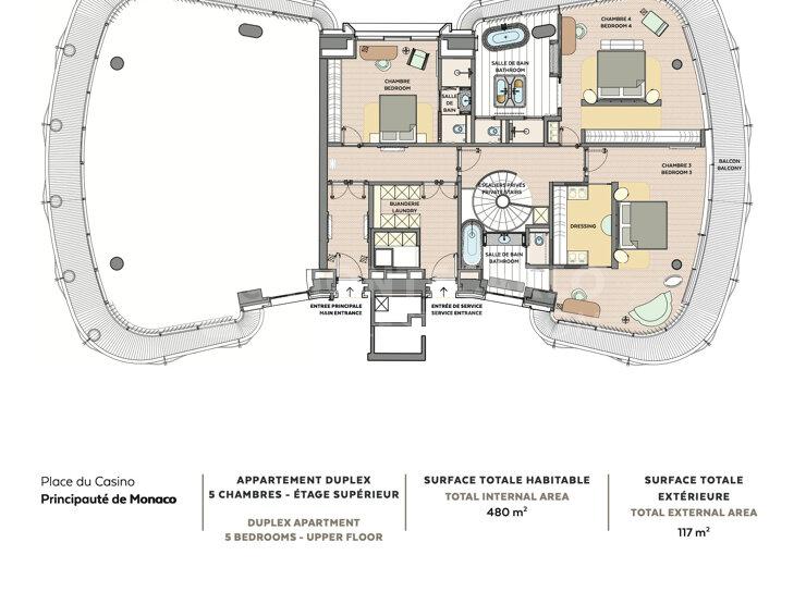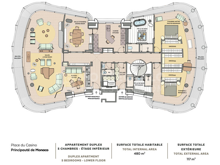 Situé aux 4ᵉ et 5ᵉ étages de l’immeuble E, ce duplex d’exception de 480 m² offre de vastes espaces de vie et un agencement unique au cœur du Carré d’Or.