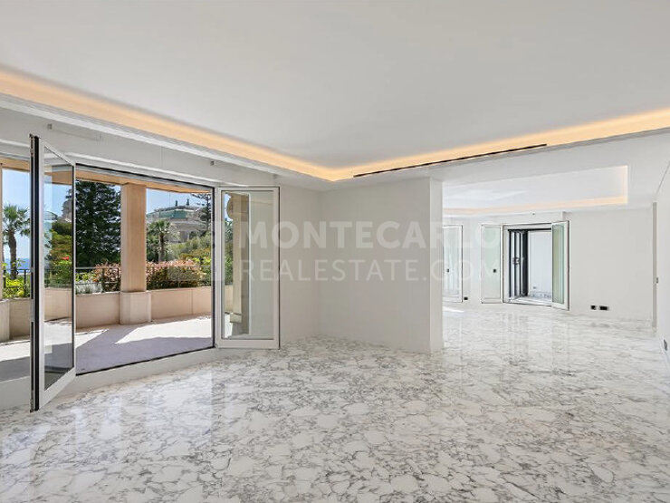 Cet appartement a récemment bénéficié d'une rénovation et d'une re-décoration sous la direction de Didier Gomez, un réputé décorateur et designer parisien, connu pour ses créations au Restaurant Yoshi de l'Hôtel Métropole et au Spa Métropole by Givenchy. Les travaux ont été réalisés par Segraeti Interiors, avec la supervision de Fabrice Notari, l'architecte de la copropriété. Il est important de noter que l'appartement, y compris la véranda, sera livré non meublé.