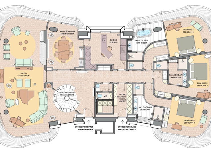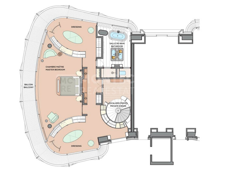 Ce magnifique duplex situé dans le bâtiment B offre une surface habitable de 410 m², avec des balcons entourant l’appartement et offrant une vue splendide sur le Rocher et la mer.