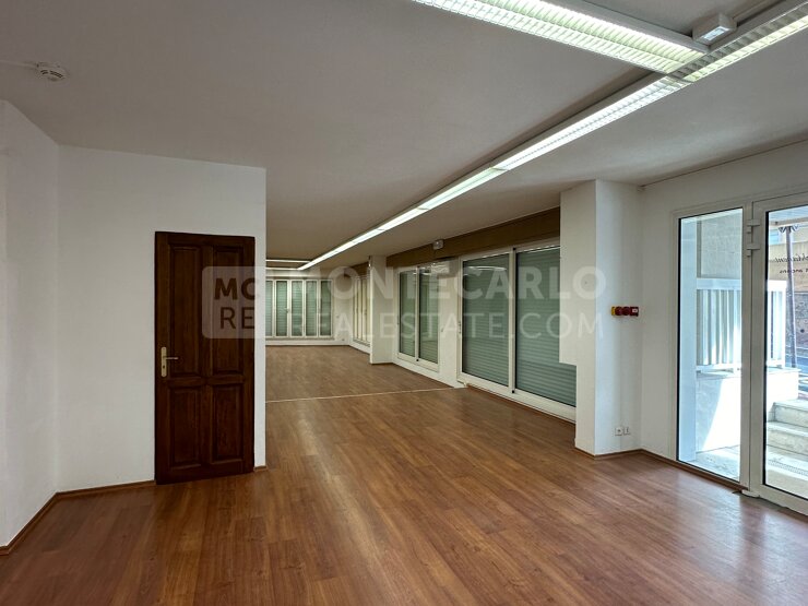 Bureau rénové avec de grandes vitrines dans l’immeuble du Titien, dans le quartier résidentiel de Fontvieille, à proximité du port.