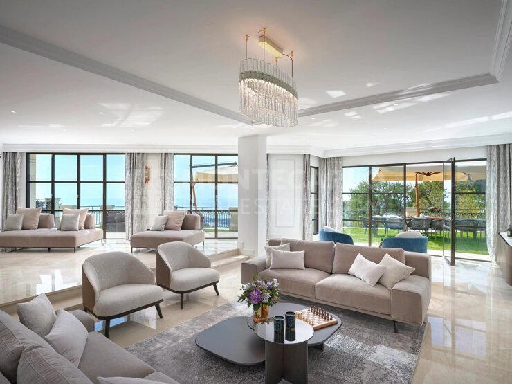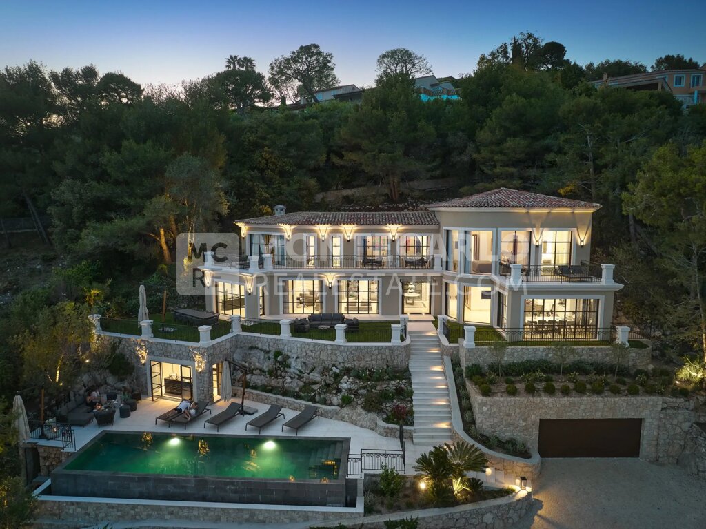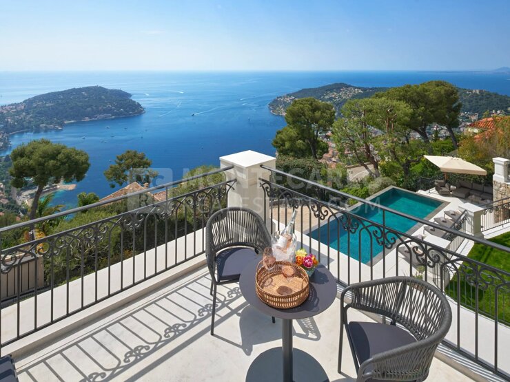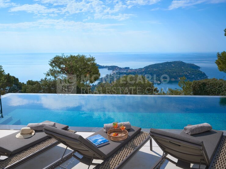 Die Villa thront auf dem Gipfel der prestigeträchtigen Domaine de Castellet und bietet einen atemberaubenden Blick auf das Mittelmeer, mit einem einzigartigen Panorama auf Cap Ferrat, das sich bis nach Korsika und Saint-Tropez erstreckt.