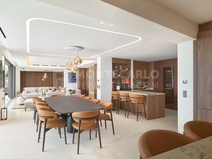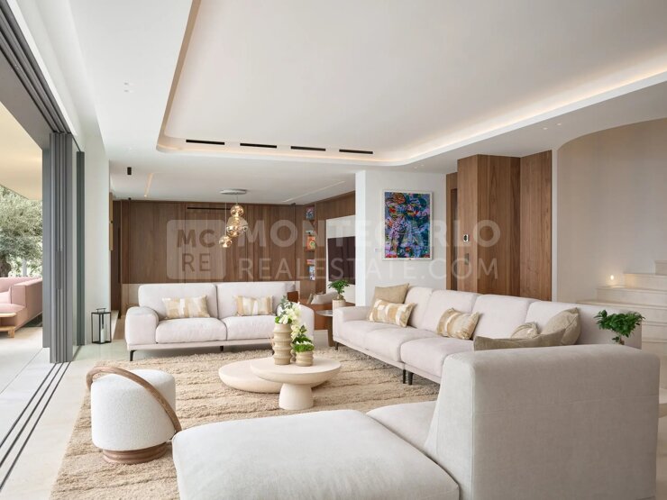 Die Villa verfügt über fünf Schlafzimmer, sieben Badezimmer, einen Aufzug, einen Parkplatz für drei Autos, mehrere Terrassen, zwei Wohnbereiche, eine zum Esszimmer hin offene Küche, eine Bar, einen Sitzbereich im Freien, einen Außenpool mit Entspannungsbereich, ein Spa mit Innenpool, einen Massageraum, eine Sauna und einen Fitnessraum.