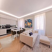 Vollständig renoviert mit hochwertigen Ausstattungen, besticht die Wohnung durch ihre großzügigen Räume, hohe Decken und Eleganz. Sie besteht aus einem hellen Wohnzimmer mit offener, voll ausgestatteter Küche, die einen modernen und geselligen Wohnraum bietet.