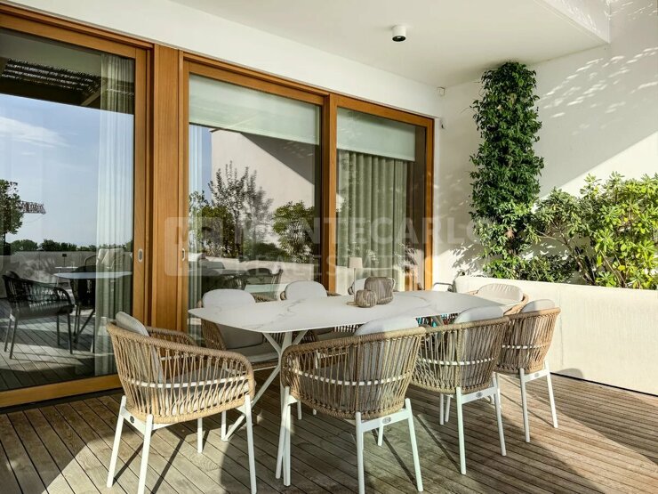 Willkommen in der Residenz L'Exotique, deren Lobby bereits den Ton für luxuriöses Wohnen vorgibt. Edle Holzverkleidungen, elegante Leuchten, komfortable Sitzgelegenheiten und raffinierte Details schaffen eine einladende Atmosphäre und bieten einen ersten Einblick in das hohe Niveau und das exquisite Design des gesamten Gebäudes. Sie profitieren zudem von einem 24/7 Concierge-Service, einem Fitnessstudio, einem Spa-Bereich mit Innenpool und Hammam. Eine eigene, zum Gebäude gehörende Parkanlage mit zahlreichen Olivenbäumen bietet Ihnen einen beeindruckenden Ausblick auf das Mittelmeer und das Fürstentum. Diese wunderschöne 3-Zimmer-Wohnung bietet einen atemberaubenden Blick auf das Meer. Dank der südwestlichen Ausrichtung genießt die Wohnung eine optimale Sonneneinstrahlung und beeindruckt mit ihrem hochwertigen Design. Die Wohnung verfügt über einen eleganten doppelten Wohnbereich und einer eleganten Küche, die komplett mit erstklassigen Geräten ausgestattet ist. Das Wohnzimmer öffnet sich zu einer großzügigen Terrasse. Ein zusätzlicher Loungebereich schafft eine Atmosphäre der Ruhe und Entspannung für Sie und Ihre Gäste. Das elegante Master-Schlafzimmer beeindruckt durch seine Größe, viel natürliches Licht und einen begehbarer Kleiderschrank-Korridor offeriert zahlreiche Staumöglichkeiten, die besonders Frauen begeistern. Das en-suite Badezimmer mit Fussbodenheizung ist mit Steinplatten, einem maßgefertigten Doppelwaschbecken, einer Badewanne und einer Dusche ausgestattet. Ein zweites Schlafzimmer mit Duschbad bietet ebenfalls hochwertige Materialien und modernes Design.