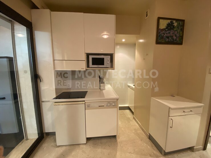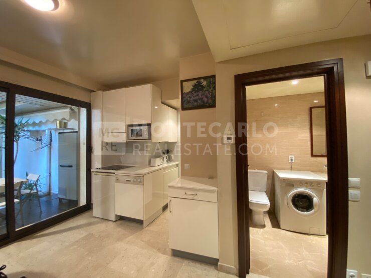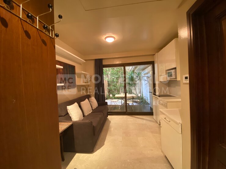 1 entrée, 1 pièce principale avec kitchenette équipée, 1 grande salle de bains en marbre et 1 jardin privatif. Climatisation réversible.