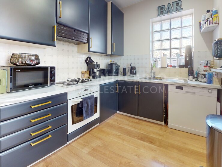 Ce grand deux-pièces avec terrasse offre une agréable vue urbaine. Il se compose d’une vaste chambre avec salle de bains privative, d’un toilette invité, d’un séjour avec salle à manger et d’une cuisine spacieuse et fonctionnelle. Le séjour et la salle à manger ouvrent sur une belle terrasse.