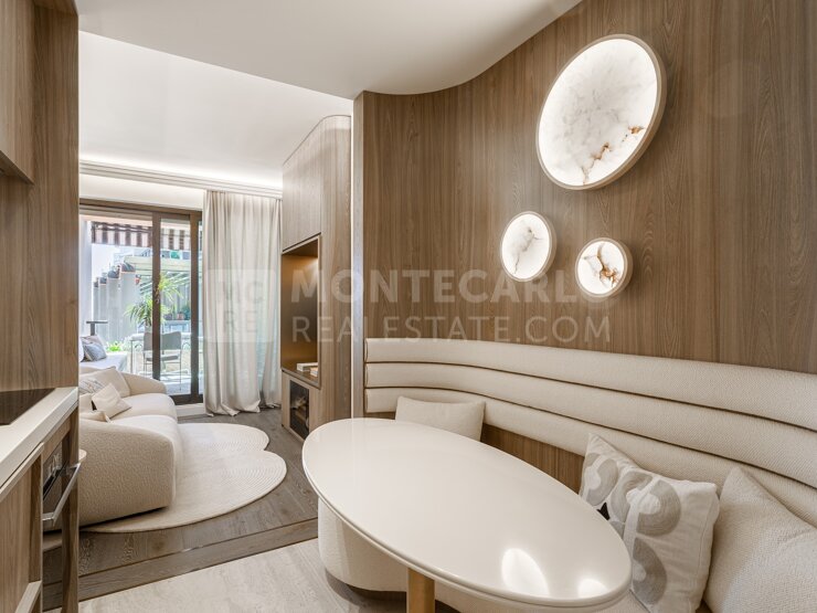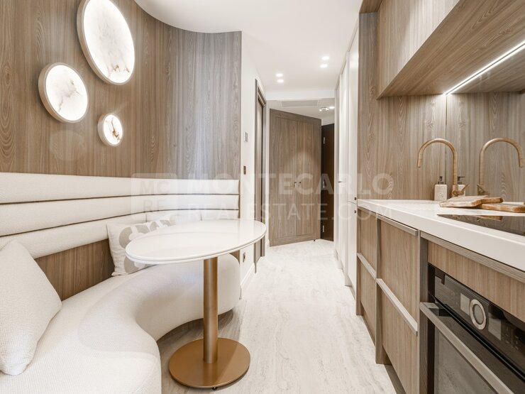 Cet appartement a subi une complète rénovation utilisant le bois avec des tons beige et crème.