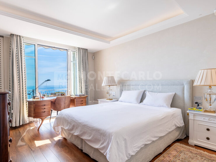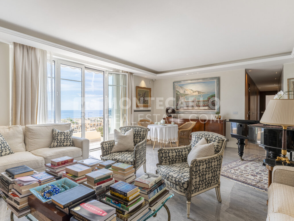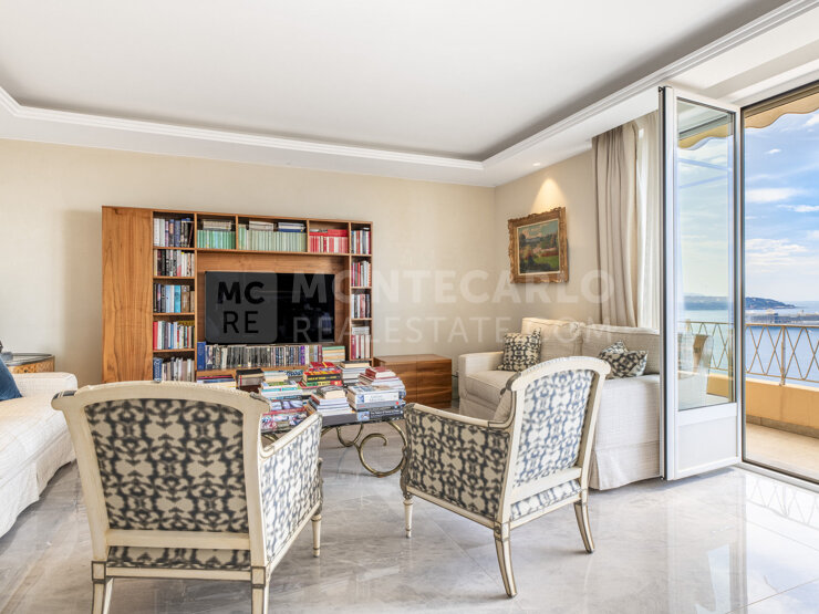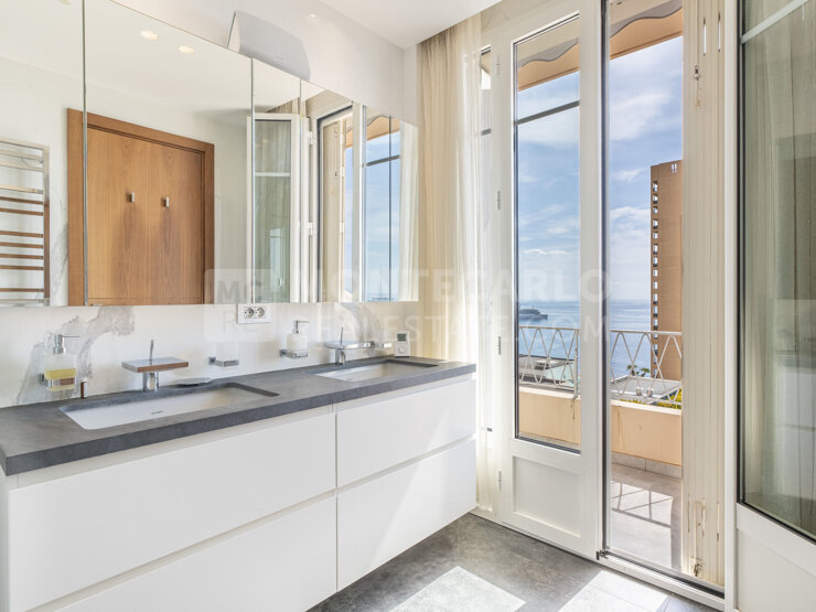 EXCLUSIVITE - Idéalement situé à deux pas de la prestigieuse place du Casino et des plages du Larvotto, ce magnifique appartement de trois pièces vous séduira par son élégance intemporelle et sa vue mer panoramique. Entièrement rénové avec des matériaux de grande qualité, son agencement a été soigneusement pensé pour allier confort et fonctionnalité : deux grandes chambres disposent chacune de leur salle de bains en suite, complétées par un salon salle à manger, une cuisine indépendante et un office, tous ouvrant sur le balcon. Un toilette invité ainsi que de nombreux rangements sont élégamment dissimulés. Un bien rare qui offre un cadre paisible et raffiné en plein coeur de Monte Carlo.