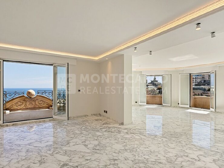 Un vaste appartement de prestige au 8ᵉ étage, bénéficiant d’une triple exposition, d’une vue mer et Casino, et de prestations hôtelières exclusives.