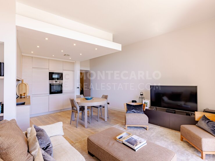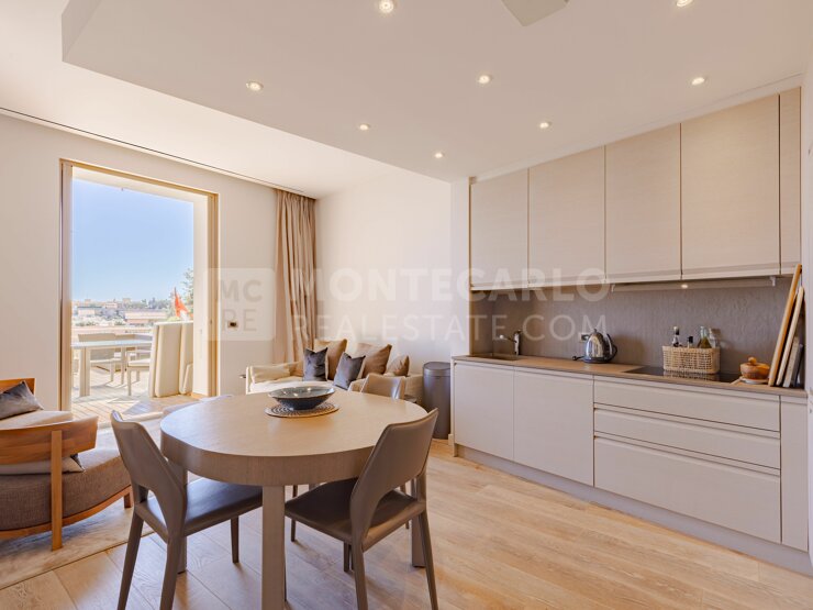 Hervorragende Zweizimmerwohnung, die komplett mit hochwertigen Materialien renoviert wurde und eine herrliche Terrasse mit atemberaubendem Blick auf Port Hercule, das Mittelmeer und den Felsen von Monaco bietet.