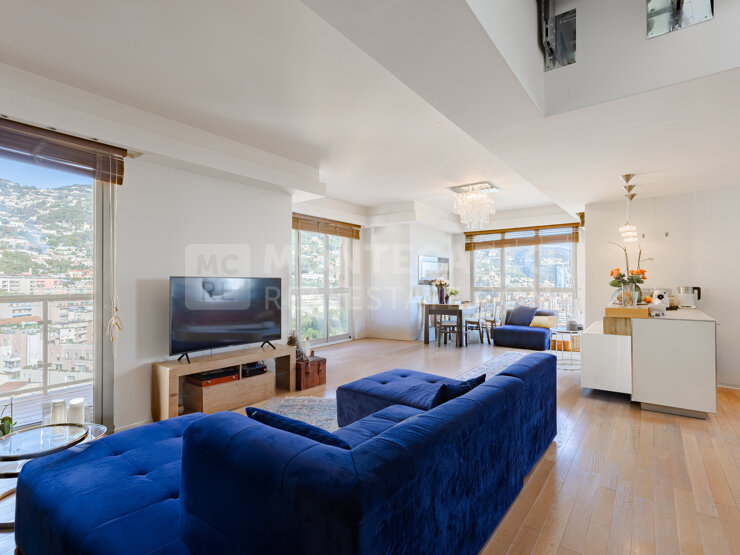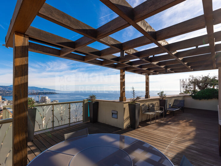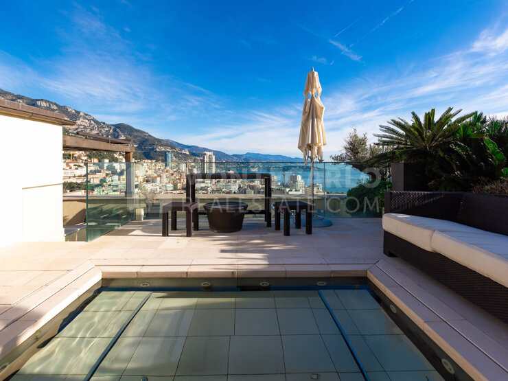 Dieses 3-Zimmer-Penthouse in der Villa Les Pins bietet herrlich helle und elegante Räume. Das Wohnzimmer öffnet sich auf eine schöne Terrasse mit atemberaubender Aussicht, die sich perfekt zum Entspannen oder Unterhalten eignet. Die Wohnung verfügt über eine voll ausgestattete moderne Küche und zwei geräumige Schlafzimmer mit begehbaren Kleiderschränken. Eine Dachterrasse bietet einen herrlichen Blick auf die Umgebung und verfügt über ein mobiles Spa für einen einzigartigen und intimen Wellnessbereich. Mit seinen hochwertigen Oberflächen verkörpert dieses Penthouse einen exklusiven Lebensstil im Herzen von Monaco.