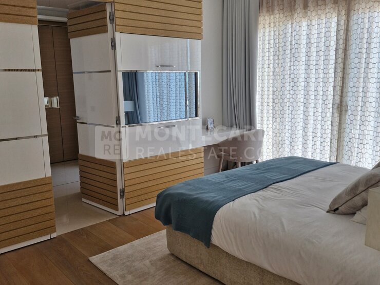 L'appartement est directement accessible par un ascenseur privatif et est composé au 5ème étage par un lumineux séjour avec cuisine ouverte entièrement équipée et dotée d'un îlot central. Cette pièce ouvre sur une large terrasse aménagée avec un vue imprenable sur la principauté. chambres en -