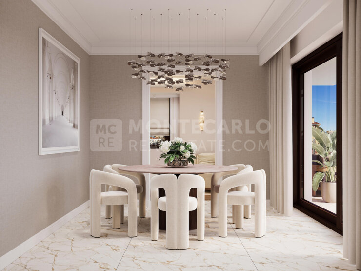 D’une surface totale de 224 m² (181 m² habitables + 43 m² de terrasse), cet appartement en étage élevé bénéficie d’une exposition sud-est baignée de lumière naturelle et d’une vue pleinement panoramique sur la mer Méditerranée, les jardins du Casino et l’architecture emblématique de Monte-Carlo.