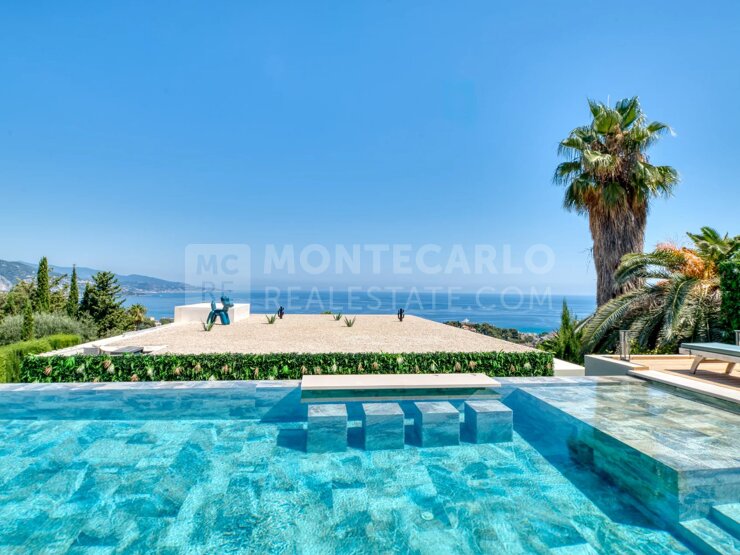 This remarkable property offers 286 sqm of living space (588 sqm in total), fully renovated with premium materials, sold fully furnished and decorated. Located in a quiet, secure residential environment with a commanding south-facing position, it boasts breathtaking views of the sea, Italy, and Cap Martin, providing a discreet, functional, and serene living experience.