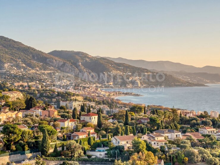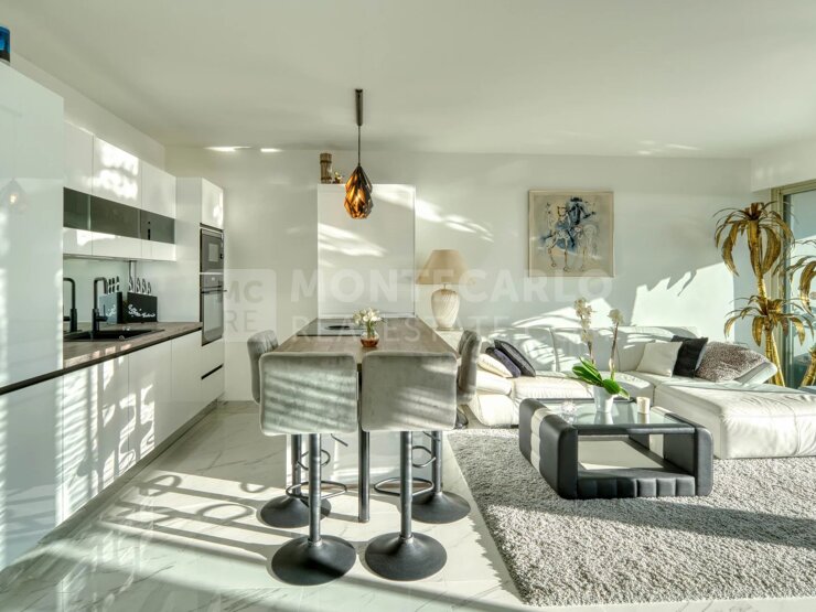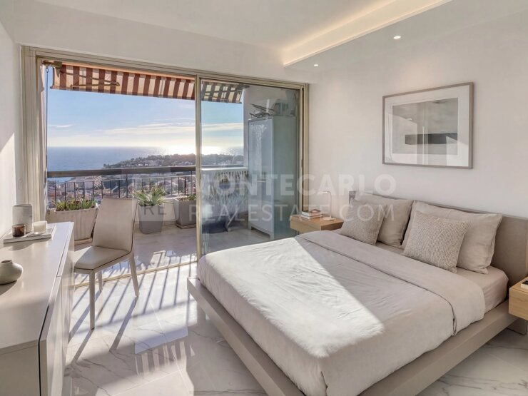 SOLE AGENT - Roquebrune Cap Martin, Hameau sector, top floor, quiet, in a secure luxury residence, spectacular 180° sea view, bright 2-room apartment in perfect condition of 53 m2, terrace of 16 m2 to the right of the bedroom, the kitchen and the living room, private parking and cellar. This apartment consists of a spacious living room with open fitted kitchen, bedroom with dressing room, bathroom and separate toilet.