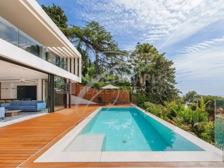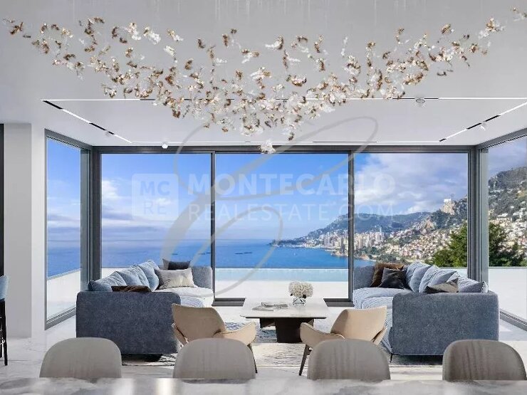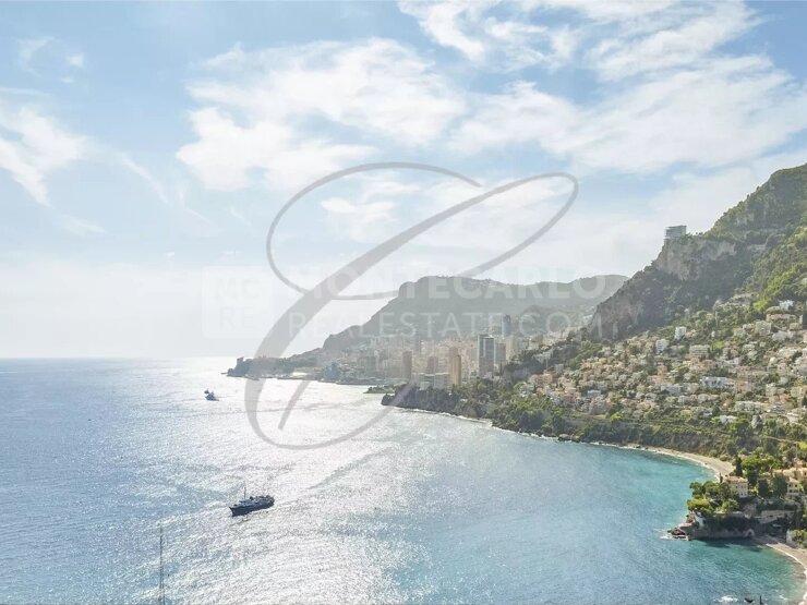 Facing the bay of Monaco, luxurious new contemporary villa furnished in the heart of a garden with a panoramic sea and Monaco view. Double reception, equipped kitchen, 5 bedrooms with en-suite bathrooms. Cinema room. Spa with relaxation room, hammam/sauna, and gym. The entire villa is served by two elevators. A large garage completes this exceptional property.