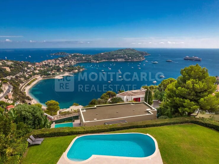 This villa enjoys a privileged location on a flat 1,580 m² plot, offering panoramic views over the Bay of Villefranche-sur-Mer and Cap Ferrat. It features 225 m² of living space spread over two levels. On the pool level, it offers a spacious reception area including a dining room, an independent kitchen, an office, the master suite with its bathroom, as well as guest toilets. The lower level includes two additional bedrooms, a bathroom, separate toilets, and a games room. The property also includes an independent studio in need of renovation, a large garage, and four outdoor parking spaces. The villa also offers significant potential for extension, with visual plans already prepared for a 380m2 villa. Agency fees chargeable to the seller.