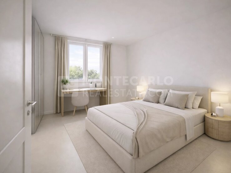 The apartment enjoys open views over greenery, with a slight lateral sea view, creating a calm and bright atmosphere.