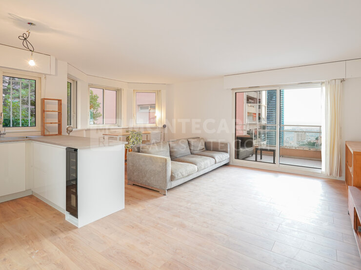 Located in Beausoleil, on the immediate border with the Principality of Monaco, this two-bedroom apartment is situated on a high floor within a prestigious residence, offering a refined and secure living environment. The interior layout features a living room with open-plan kitchen, two bedrooms, and a bathroom.