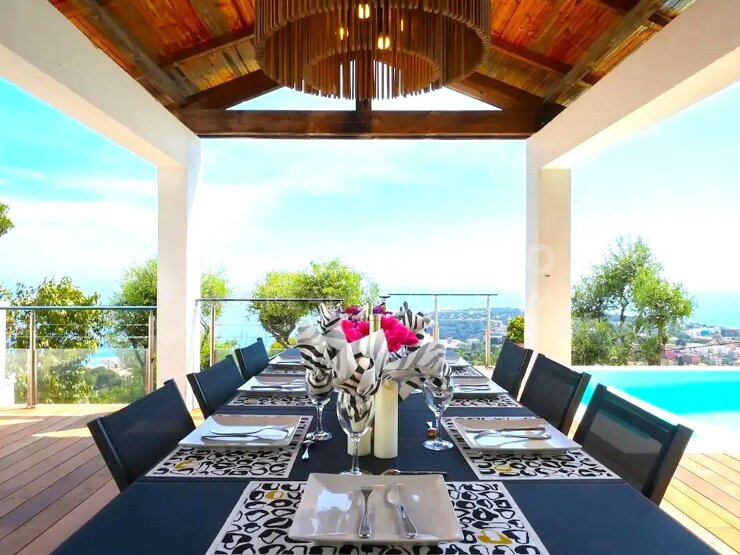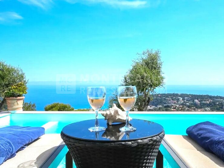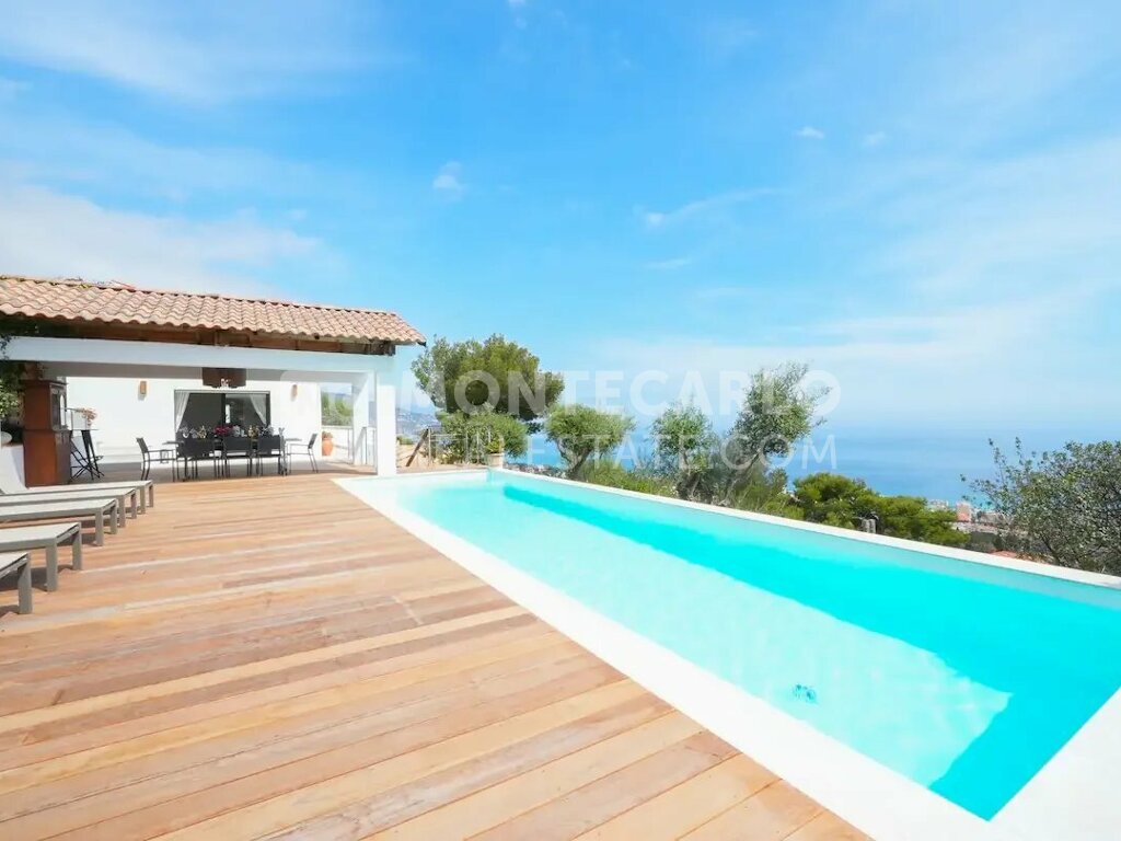 Located in Roquebrune-Cap-Martin, just 5 kilometers from Menton and the Principality of Monaco, this splendid contemporary villa offers calm and serenity, surrounded by a carefully maintained garden, with swimming pool and pool house, all enjoying a breathtaking sea view.