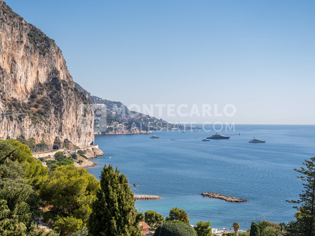 The vast living room, bathed in light, opens onto a balcony overlooking the Mediterranean, offering a unique spectacle from Saint-Jean-Cap-Ferrat to Cap d'Ail. The independent kitchen, perfectly arranged, completes the living space.