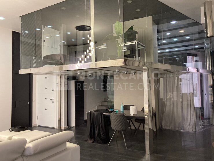 OPPOSITE Monaco, thanks to a good location, here is this large and luxurious 5-room apartment. (LC 174.68m²). With a huge living room due to its height (56m²), opening onto a beautiful and wide mezzanine. There are 3/4 bedrooms, kitchen and bathrooms, dressing rooms, laundry room and other rooms. With a terrace of 19m². With a cellar. Parking nearby.