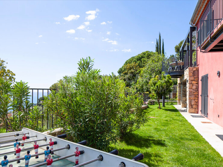 Outside, a landscaped garden surrounds the villa, featuring mature olive trees, a large fig tree, citrus trees, and a climbing kiwi plant. The infinity pool overlooks a pétanque court, with additional storage space underneath. There’s also a barbecue area with seating for 12, a closed workshop, and two covered parking spaces.
