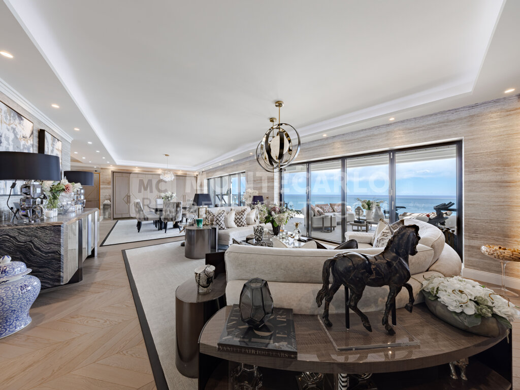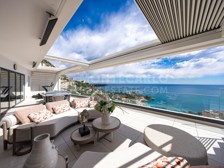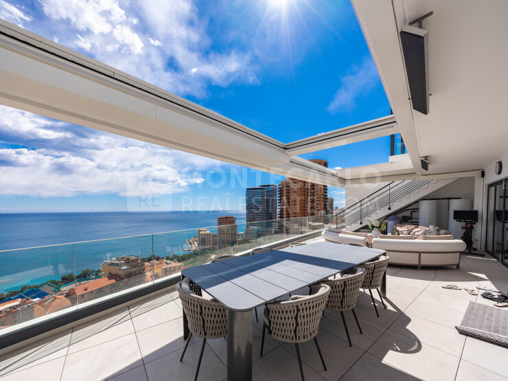 It consists of a bright living room, a reception area and a living room opening onto a large terrace enjoying an exceptional view of the sea and Monaco, as well as a fully equipped and carefully fitted kitchen.