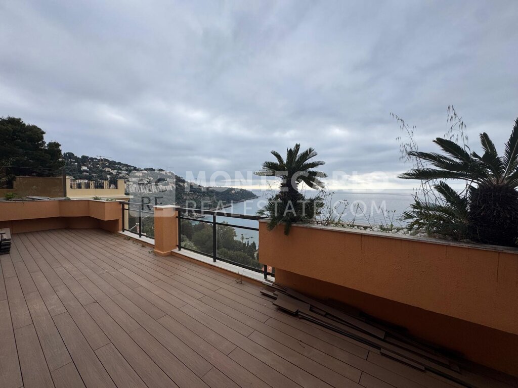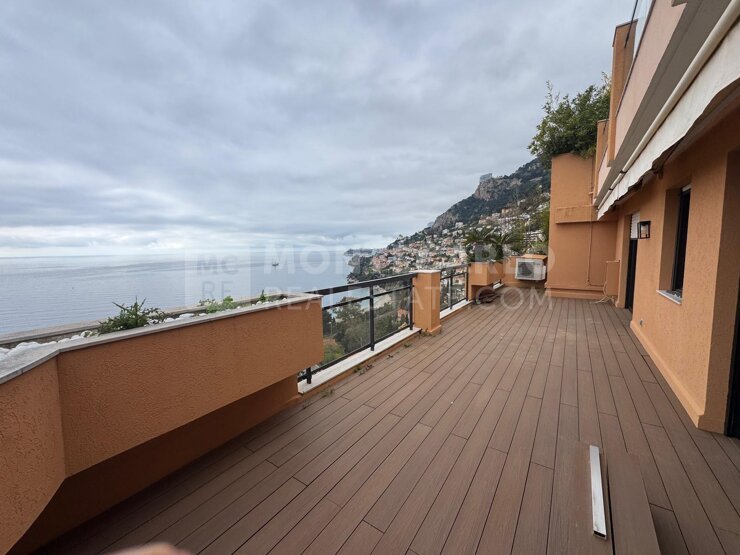 Roquebrune Cap Martin, renovated duplex composed of a living room with equipped kitchen, a bedroom with full bathroom, all opening onto a large terrace offering an exceptional sea view. Access to the upper floor is through a comfortable ladder that leads to 2 bedrooms, 2 bathrooms and a huge terrace overlooking the sea. A space also for summer cooking