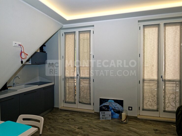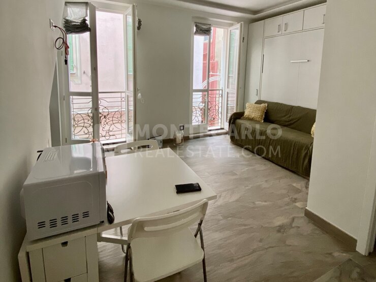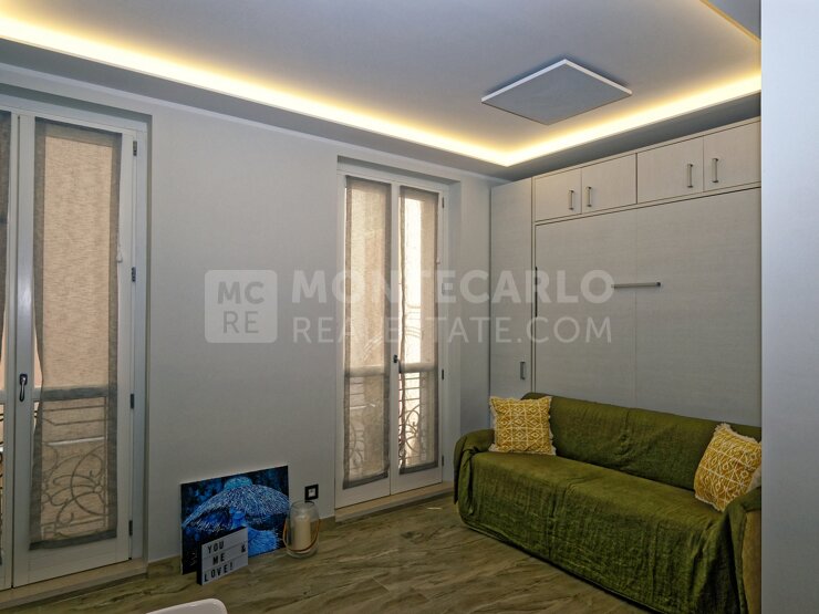 Lovely studio apartment located on the 1st floor without elevator recently tastefully renovated in a quiet condominium in the heart of Monaco-Ville. The apartment is completely renovated, consisting of a bright living room with a small open fitted kitchen, a double Murphy bed, a shower room, separate toilet, radiant heating on the ceiling. All windows have double glazing for extra acoustic comfort. The apartment is secured by an armoured door Law 1291