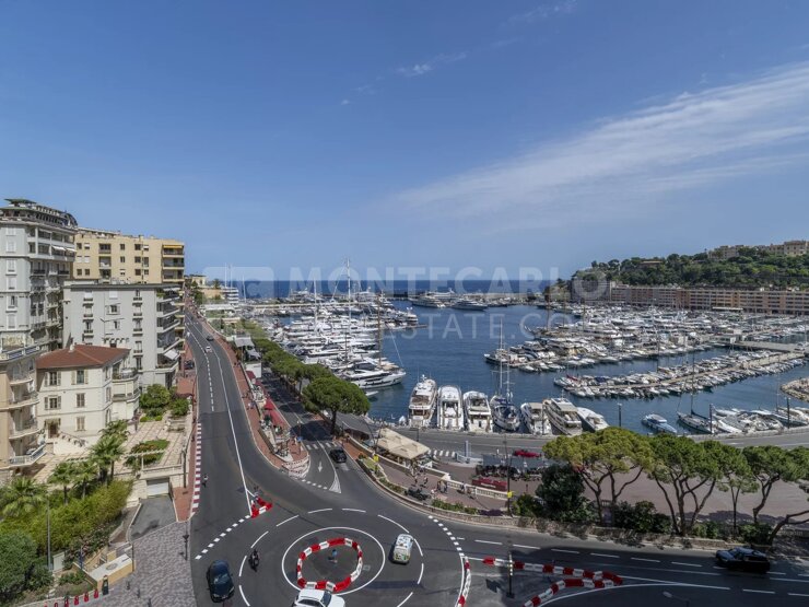 Harbour of Monaco, rare entire floor apartment, totaly refurbished by an architect with high quality materials. Beautiful view of the harbour Hercules, Formula 1 track and the Rock. Mixed use possible. 4 parking spaces and 5 cellars in the building.
