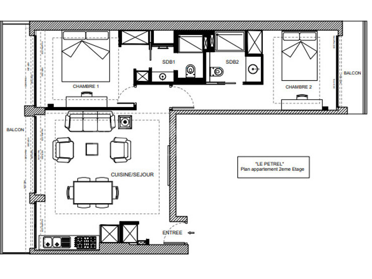 It consists of an entrance hall, a living room and open kitchen, with terrace, and two bedrooms and two bathrooms with terraces also.