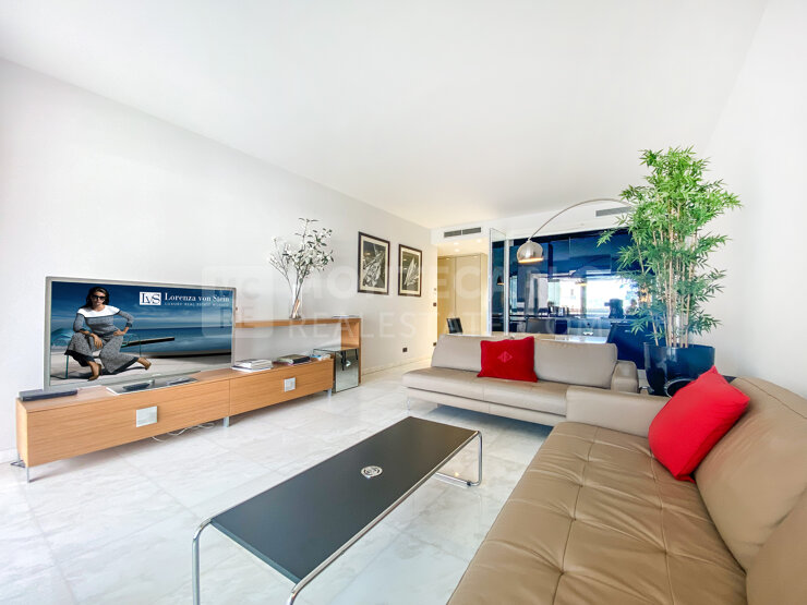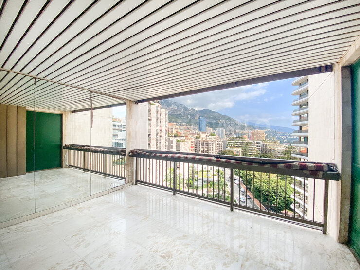 The apartment is composed of an entrance hall with storage, a living room with an open-plan fully equipped kitchen leading to a vast terrace overlooking the Casino Gardens, two bedrooms each with their own marble en-suite bathroom and an abundance of storage. A further terrace off the second bedroom boasts stunning views of the port and the rocher.