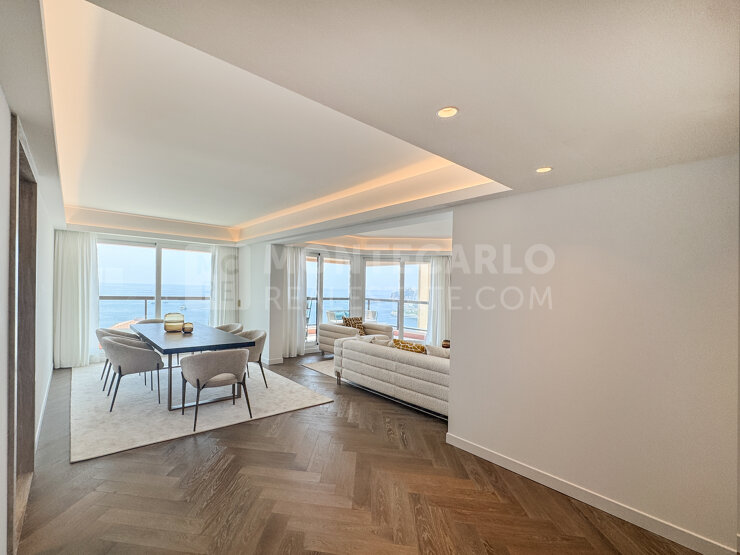 In the prestigious Monte Carlo Sun residence, you will find a stylishly renovated and elegantly designed 4-room apartment that meets the highest standards of living. It combines timeless sophistication with modern comfort at the highest level. The spaciously designed living and dining area features an open layout and impresses with floor-to-ceiling windows, creating an exceptionally bright and inviting atmosphere. Elegant sliding glass doors lead to the private terrace, allowing for a seamless transition between indoor and outdoor living. Facing southeast, the apartment offers an incomparable, unobstructed panoramic view of the Mediterranean Sea. The high-end kitchen delights with its sophisticated design and top-quality appliances – ideal for discerning gourmets. The bedrooms are generously sized and tastefully furnished. Large, custom-built wardrobes offer ample storage space. The en-suite bathrooms are finished in exquisite marble, completing the luxurious ambiance of this exclusive property. The Monte Carlo Sun residence offers its owners a first-class 24/7 concierge service and a well-maintained outdoor swimming pool – perfect for relaxing moments under the Côte d’Azur sun. In the immediate vicinity are the renowned country and tennis club, as well as the beaches, all within walking distance. The offer also includes a spacious cellar and a private parking space.