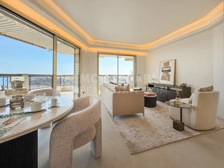 Nestled on an elegant, tree-lined street, Beverly Palace stands as one of Monaco’s distinguished high-end residences, offering refined living enhanced by attentive concierge service. This immaculate apartment has been fully renovated and furnished to the highest luxury standards, creating a truly turn-key home where every detail has been carefully curated. The property features two beautifully appointed bedrooms and three contemporary bathrooms, along with a fully equipped kitchen designed for both convenience and style. The bright, open-plan living spaces extend seamlessly onto a large wrap-around terrace, the highlight of the residence. From here, sweeping panoramic views unfold over Port Hercules, the shimmering yachts, and the iconic Rock of Monaco, offering a breathtaking backdrop day and night. With its exceptional views, flawless finishes, and ready-to-move-in appeal, this residence at Beverly Palace represents a rare opportunity to enjoy the best of Monaco in absolute comfort and elegance.