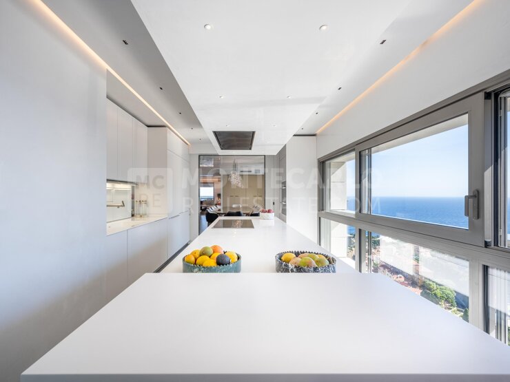 The apartment features a vast living space with a lounge opening onto a large terrace, offering breathtaking panoramic views over the Principality, the Prince’s Palace and the endless blue of the Mediterranean Sea.