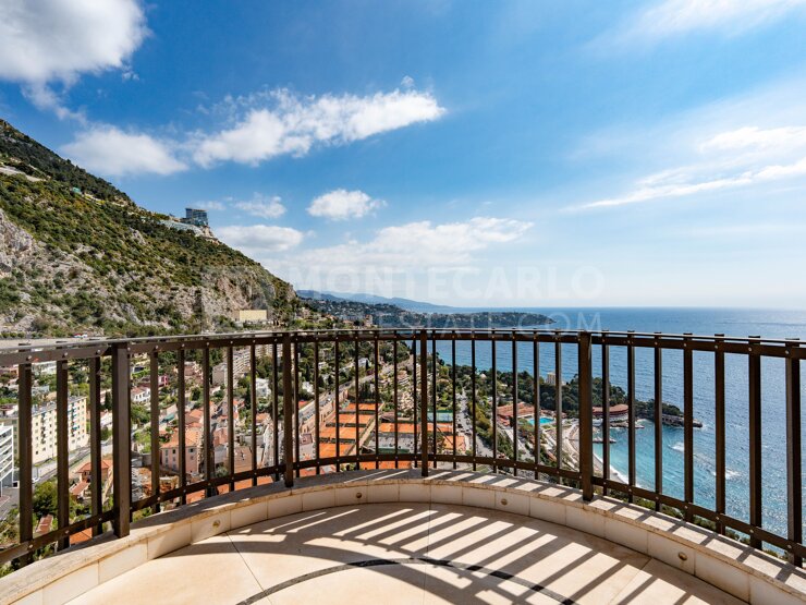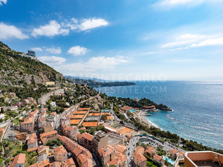 With a total surface area of 230 m2, it consists of: an entrance, a guest toilet, a large double living room opening onto a closed terrace veranda type with a panoramic view of the sea and the Principality of Monaco, a fully equipped kitchen. Stairs lead to the upper floor where one can find, a service entrance with a small laundry area, with many storage cupboards, a first bedroom with shower room, a second presenting two parts, a main one and an old fenced terrace, with shower room and the third bedroom, the master bedroom, with dressing room, shower room, opening onto an open terrace with panoramic views.