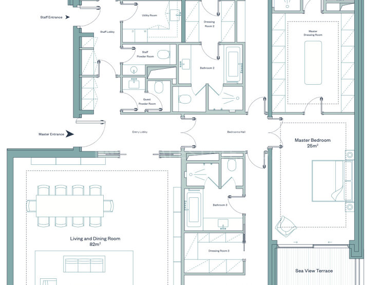 In the new luxurious space celebrating the soul and sensations of the Mediterranean, superb 4-room apartment located on the 6th floor, including a master entrance, a service entrance, a living-dining room, a master bedroom with fully fitted dressing room and separate bathroom, two bedrooms with a fitted dressing room and a separate bathroom, a fitted and equipped kitchen, a laundry room, sanitary facilities and cloakrooms for guests, sanitary facilities for the staff, two front terraces, one of which has a green space (sea side) and a rear terrace (hill side). The building has a fitness area, a cinema room, a meeting room