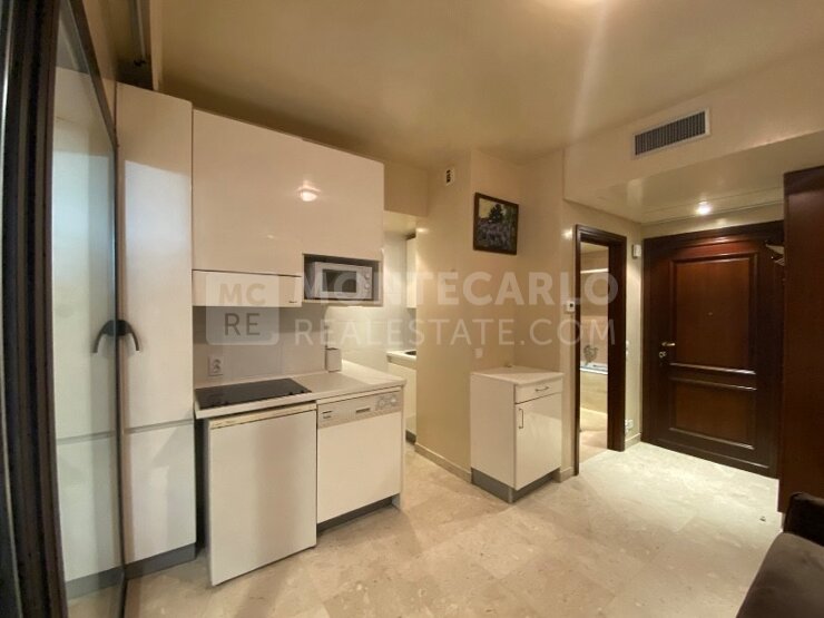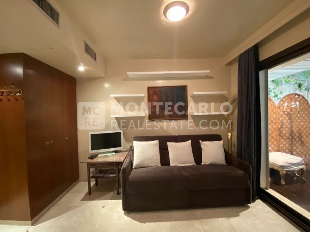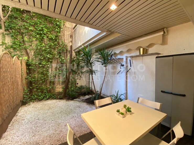 Entrance, living room, bathroom, kitchenette, cupboards, air conditioning, loggia, small garden