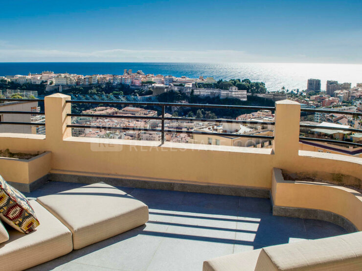 Magnificent duplex penthouse completely renovated in a Bourgeois building on Boulevard de Belgique. It consists of an entrance, a living / dining room opening onto a balcony and offering a beautiful sea view, an open equipped kitchen, 2 bedrooms with shower rooms, each opening onto a balcony, a third bedroom with its bathroom. On the upper floor, spacious terrace with pergola and summer kitchen with sea view.