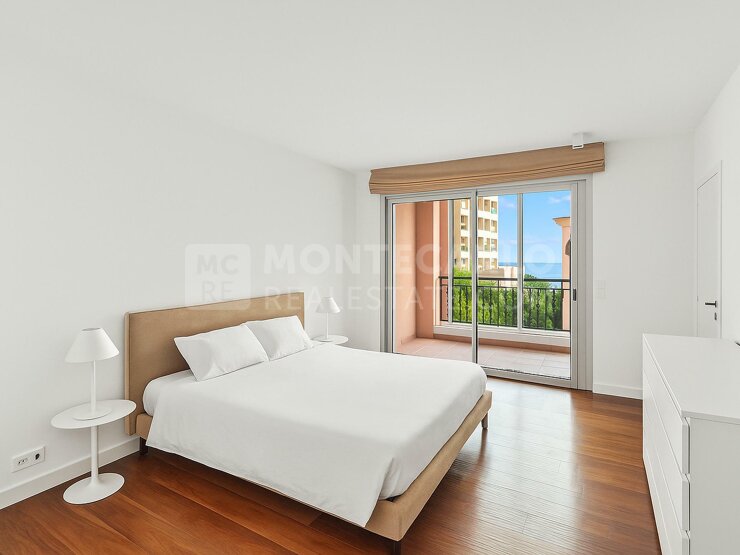 The main balcony, deep and fully usable, offers ample space for dining or relaxation in total privacy, with unobstructed views of the Mediterranean and surrounding gardens.