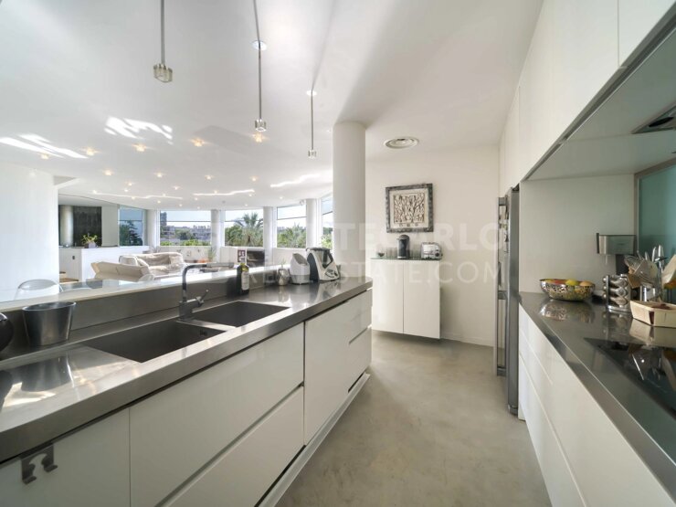 L'appartement aux volumes généreux, au style contemporain, se compose d'un immense séjour de 120 m2 avec cuisine ouverte entièrement équipée, et grandes baies vitrées avec vue sur le parc de la résidence et la mer, spa, chambre parentale avec salle de bains et dressing, toilettes invités.