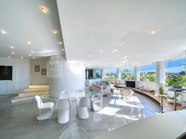 Roquebrune-Cap-Martin, proche mairie et accès Monaco, exposé sud, dans résidence de standing sécurisée, avec piscine, jardin, tennis, salle de sport et gardien, au calme, magnifique loft 6 pièces de 330 m2 décliné sur 2 niveaux, rénové avec goût en 2009, cave et parking couvert privatif.