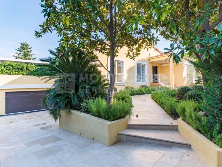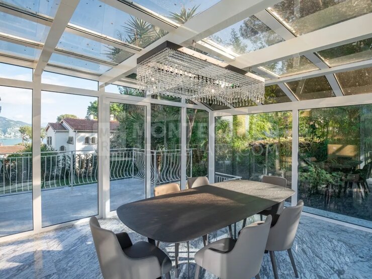 Magnifica villa di nuova costruzione situata a Cap Martin, ristrutturata con servizi di lusso, immersa nel cuore di un giardino con piscina e vista mare.