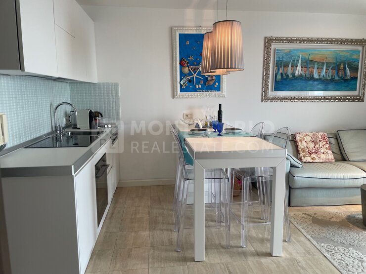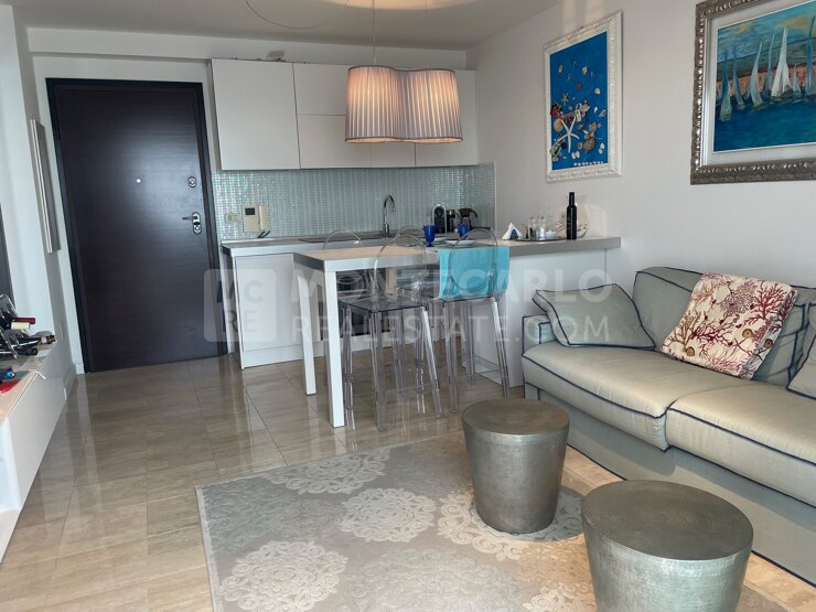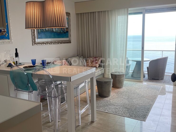L’appartamento è composto da un ingresso con armadio a muro, un soggiorno luminoso con cucina completamente arredata e attrezzata, e una camera da letto che si apre su una terrazza con una vista mozzafiato sul Mar Mediterraneo e Cap Martin.