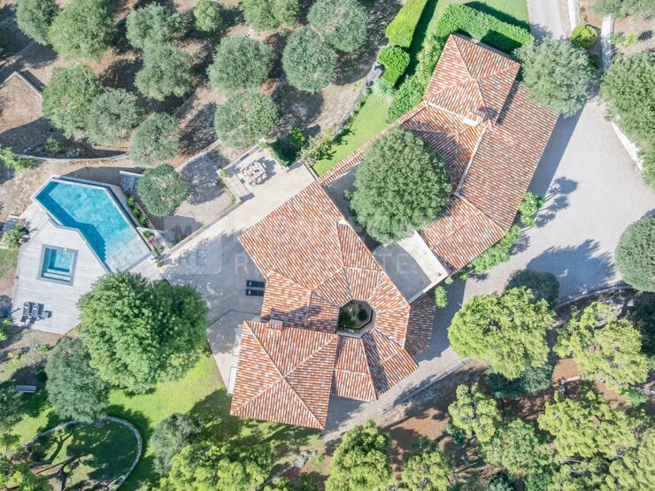 Gli spazi esterni, perfettamente pensati per accogliere e godere della dolcezza della Costa Azzurra, comprendono una piscina a sfioro, una jacuzzi, una cucina estiva attrezzata con forno a legna per pizza e una zona pranzo all’ombra di un ulivo secolare.
