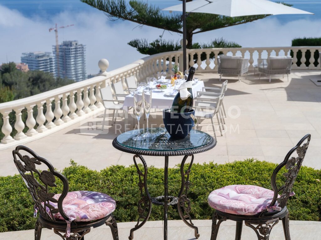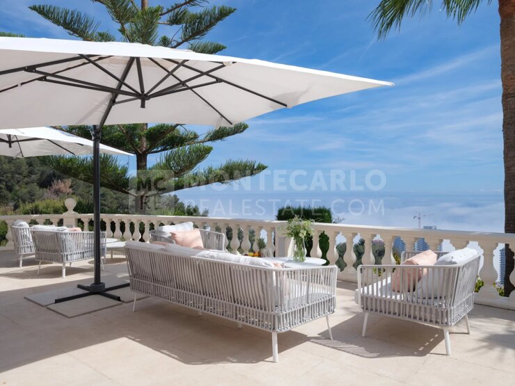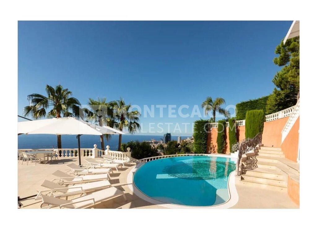 Situata in un ambiente verde e totalmente privato, in grado di ospitare fino a 13 persone, questa imponente villa francese contemporanea di 800 m2, esposta a sud, con vista mozzafiato sul mare e su Monaco.