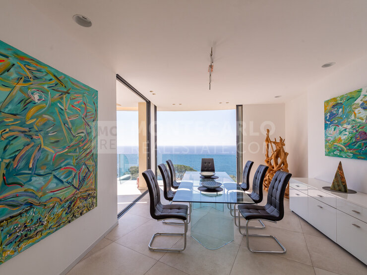 Caratteristiche: Tranquilla vista panoramica sul mare, posizione sicura, vicino alla spiaggia, piscina a sfioro, enorme terrazza sul tetto con vista 180o per eventi privati e aziendali, 365m2 di spazio abitabile, due cucine attrezzate (cucina professionale indipendente per lo chef) centro fitness.